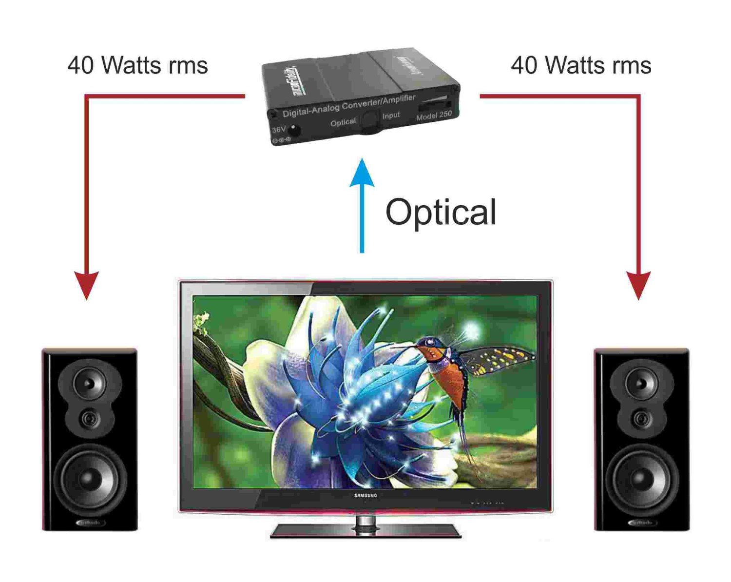 Выходная мощность: 2 х 40 Вт среднеквадратичное значение.