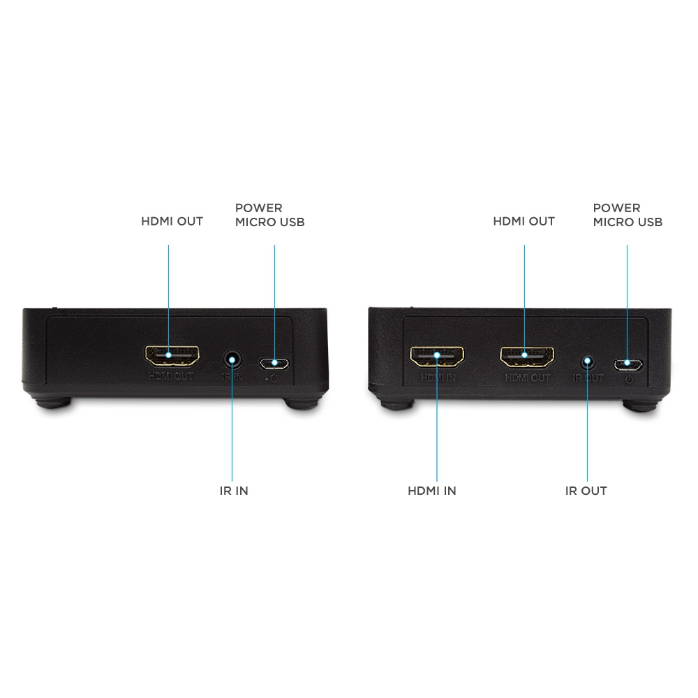 Передатчик: HDMI вход, Micro USB (для питания), 2,5 мм разъем (для ИК-излучатель); приемник: Выход HDMI, Micro USB (для питания), 3,5 мм (для ИК-излучатель) |