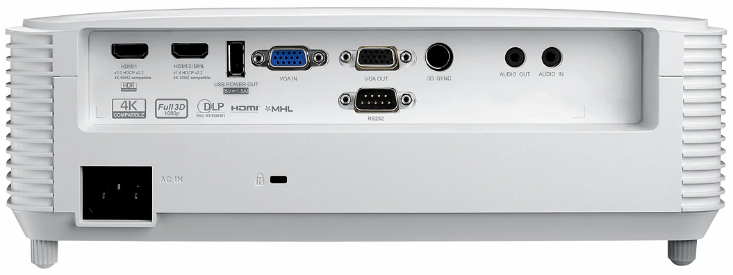 Full HD 1080p.DLP.Совместимость с 4K.HDR.4,500 Lumens.High Contrast.MHL.USB.Amazing Color.Eco+.Energy Saving.Auto power off.Long Lamp Life.Integrated speaker.