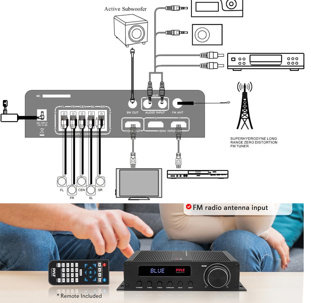 5.1-канальный усилитель.Легкий и компактный размер.Bluetooth-беспроводной приемник потокового аудио.FM-радио.HDMi входы/выход.Пульт дистанционного управления.
