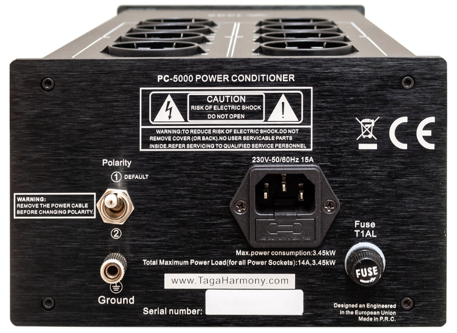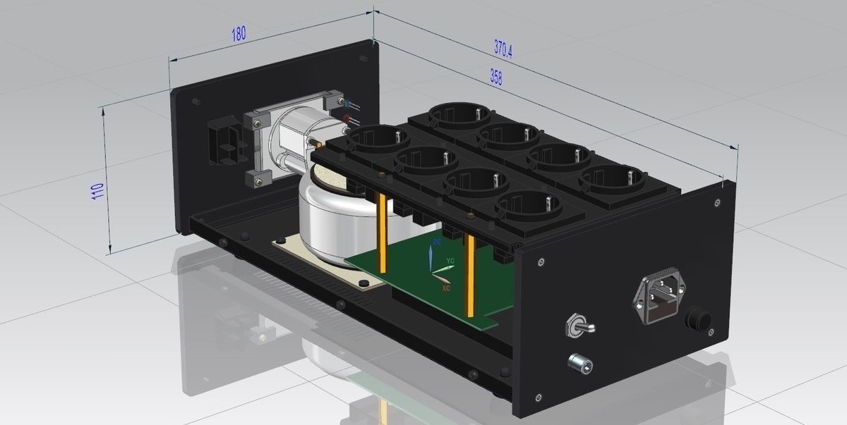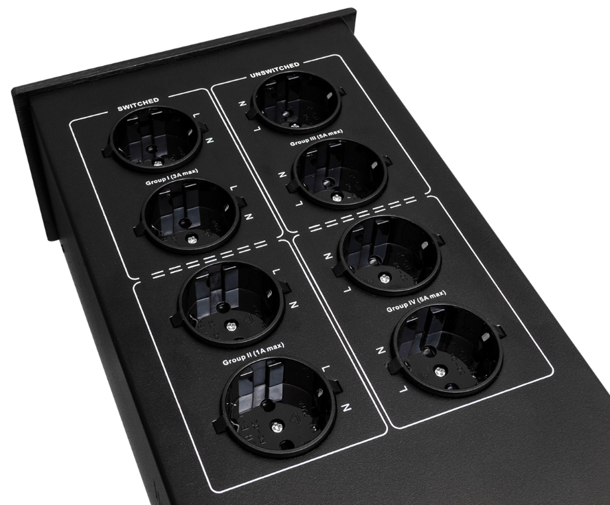 | Розетки | Тип Schuko: 4 коммутируемых, 4 некоммутируемых. 4 группы (по 2 розетки в каждой): Коммутируемые: I (макс. 3A) цифровые аксессуары, II (макс. 1A) источники звука. Некоммутируемые: III (макс. 5A) предусилители и аксессуары, IV (макс. 5A) усилители. |