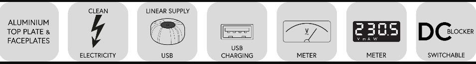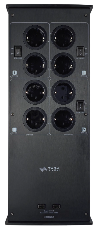 | Розетки | Тип Schuko (230 В – 240 В): 4 переключаемых 4 непереключаемых 4 группы (по 2 розетки в каждой): Переключаемые: I (макс. 3 А) цифровые аксессуары [блокиратор постоянного тока] II (макс. 1 А) источники звука Непереключаемые: III (макс. 5 А) предусилители и аксессуары [блокиратор постоянного тока] IV (макс. 5 А) усилители [блокиратор постоянного тока] Порты USB-A (линейный источник питания): x 2 (5 В) |