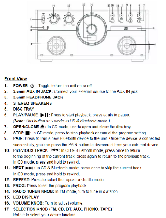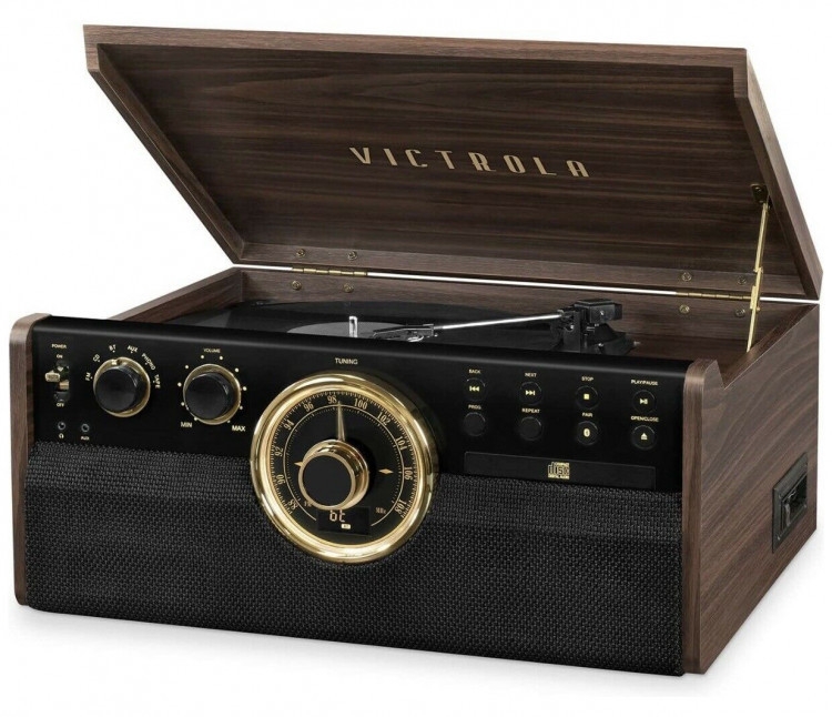 Ретро стиль 50-х годов.6-в-1: Bluetooth,CD-плеер, дополнительный вход 3,5 мм,3-х скоростной проигрыватель виниловых пластинок, кассетный плеер, радио. Классическое FM-радио с аналоговым тюнером, светодиодной подсветкой по кругу,встроенные стерео-динамики.