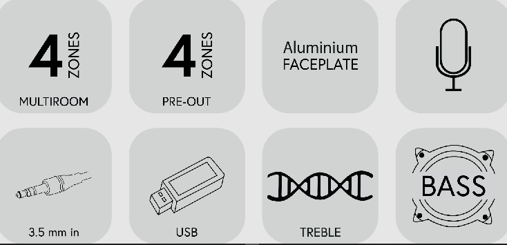 Каждая зона с независимыми : выбором входного аудиоисточника (из 3 встроенных), регулировкой громкости и звука (высокие частоты / низкие частоты) для воспроизведения индивидуальной музыки на разных уровнях громкости в отдельных комнатах.